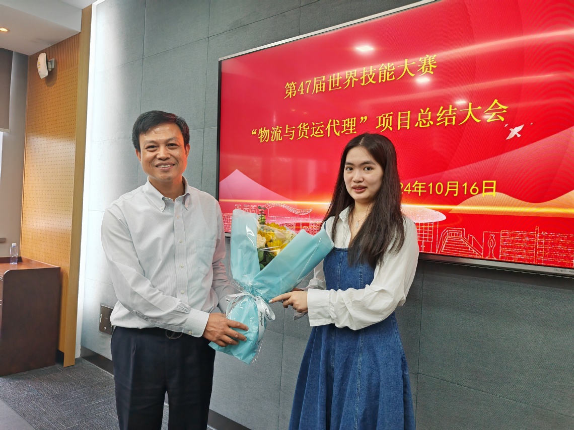 谢华清校长作总结发言,谢校长再次向周雨欣同学获得47届世界技能大赛“货运代理”项目金牌表示祝贺,并代表学校感谢周雨欣同学能够在世界大赛中发挥出色,为学校、为上海市、为中国争得了荣誉。谢校长表示,周雨欣同学取得的成绩正体现了我校培养“精技术、重责任、国际化”的应用型创新人才定位的准确性,是学生个人创新与我校良好的教育教学模式完美结合的具体体现。希望周雨欣同学能够继续发挥余热,带动更多的学生能够在将来站在世界舞台,继续为学校争得荣誉。随后谢校长还对周雨欣未来发展规划进行了询问与关心,并代表学校向周雨欣同学赠送鲜花,周雨欣也将具有特别意义的第47届世界技能大赛纪念徽章回赠给谢校长,以表达对谢校长关心关爱的感谢。