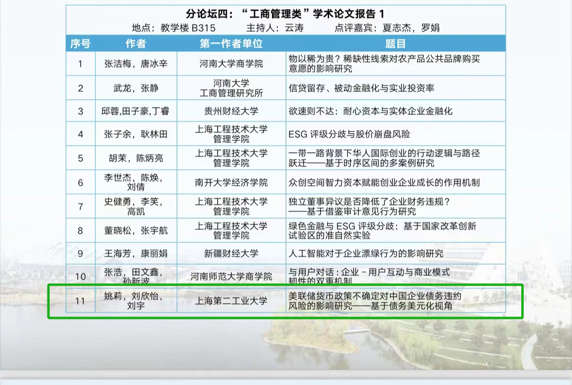 11月2日,我院2023级国商专业研究生刘欣怡和国商专业教师刘宇共同参加了由上海工程技术大学和上海师范大学商学院共同主办的经管期刊创新发展论坛(2024),刘欣怡同学在会议论坛中宣讲合作论文《美联储货币政策不确定对中国企业债务违约风险的影响研究――基于债务美元化视角》,并在现场得到了与会专家学者的互动点评。专家十分肯定论文的研究主题和研究方法,并在具体的数据处理方面给予了恳切的建议。参加此次论坛对我院师生发表高水平期刊论文具有重要的帮助和指导意义,极大地促进了我院国商专业研究生学术交流能力和科研水平提升。